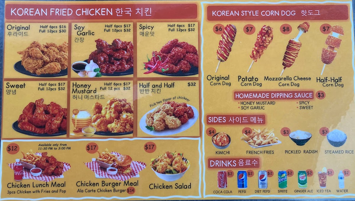 Smile Chicken is not just about chicken; it's about the experience. The half and half corndog showcases a unique blend of flavors, with molten cheese and a crisp coating dusted lightly with sugar that elevates every bite. Diners rave about the soy garlic chicken—a sensational dish brined to perfection with a delightful crispy skin that snaps with each crunch.